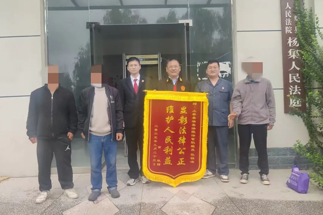 “耿法官、张助理,我给你们送锦旗来了!”9月23日清晨,苗某、邓某、李某三人早早来到杨集人民法庭,将一面锦旗郑重地送到办案法官和法官助理手中,质朴的笑容与真诚的谢意为这个普通的秋日增添了别样的温度。
